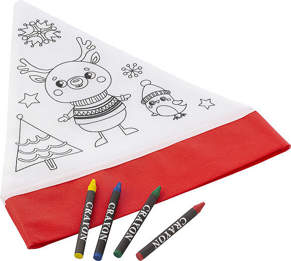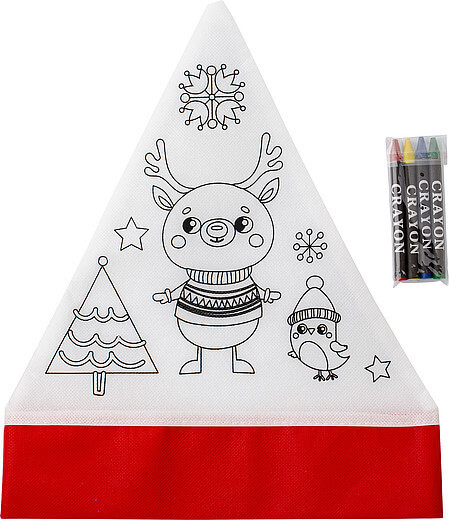 Netkaná (80 gr/m2) vianočná čiapka s obojstrannou potlačou, vhodná na farbenie. Vrátane štyroch pasteliek (zelená, červená, žltá a modrá) v sáčku.